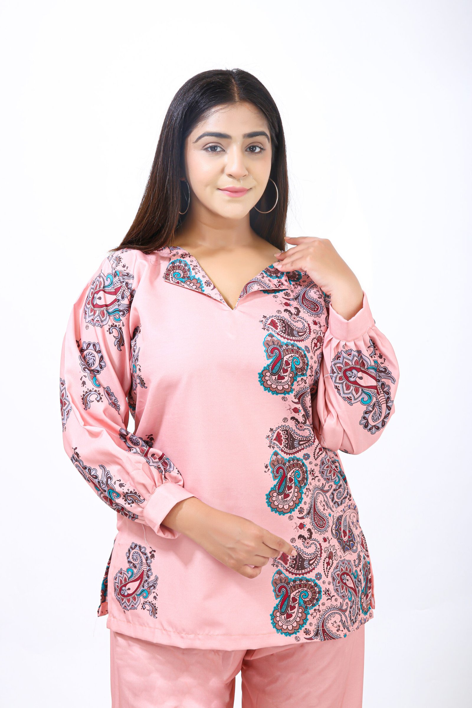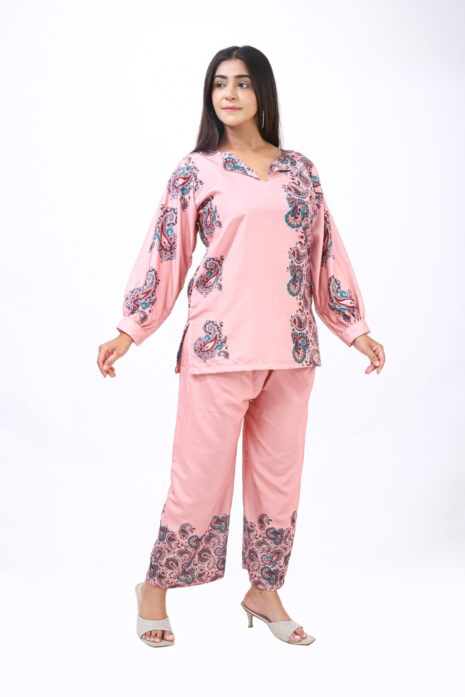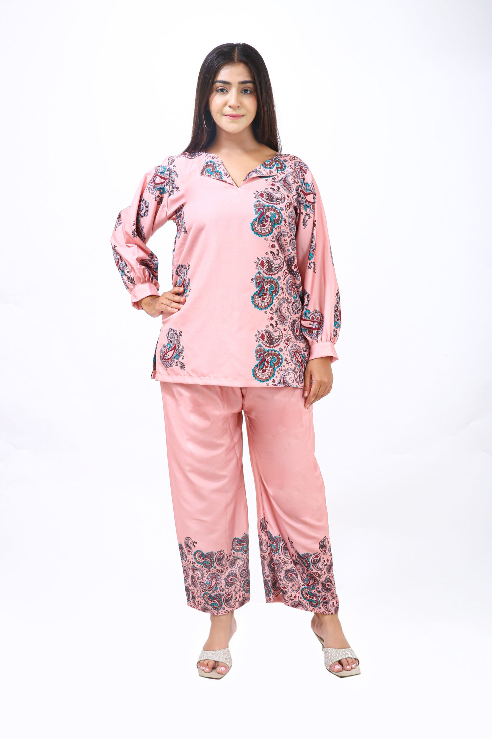 The top features a soothing blush pink base adorned with intricate paisley prints in rich shades of teal, maroon, and black. The asymmetrical print placement adds a contemporary touch, while the full sleeves with gathered cuffs enhance its graceful appeal. The neckline has a soft V-cut that complements all face shapes, giving a flattering frame to your look.
